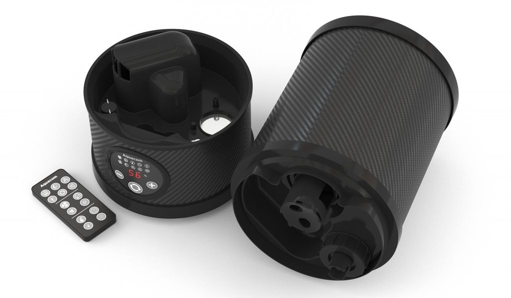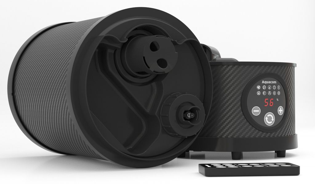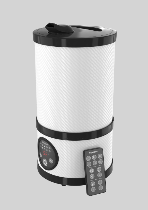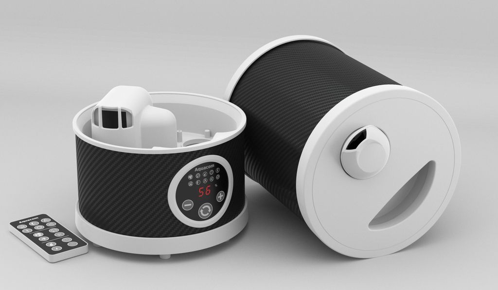 Aquacom очень прост в эксплуатации, экономичный и достаточно компактный. При своих скромных габаритах имеет шестилитровый резервуар и потребляет от 35 до 80 Вт (меньше лампочки), в то же время для сравнения не самый мощный паровой увлажнитель, имея почти в два раза меньший объем резервуара, потребляет от 300 до 600 Вт. К тому же, за счет вертикального дизайна прибор занимает совсем немного места.